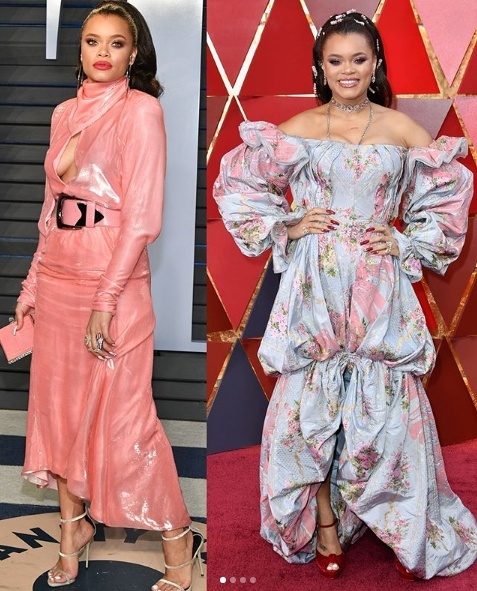 Andra Day in pink Nina Ricci after an an off-the-shoulder Zac Posen look