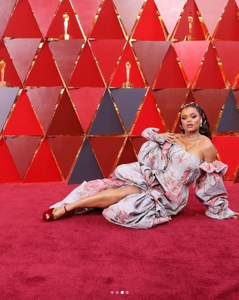 Andra Day in pink Nina Ricci after an an off-the-shoulder Zac Posen look 3