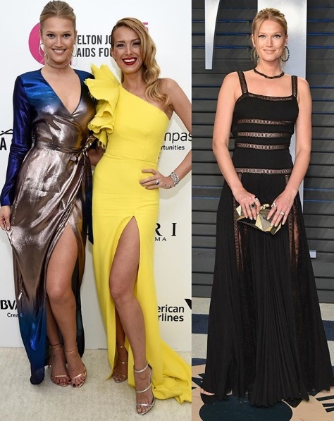 Toni Garrn in Siran poses alongside Petra Nemcova before changing into an Elie Saab number