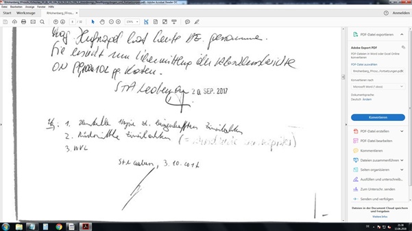 Siehe Ausschnitt aus dem Antrags- und Verfügungsbogen der Staatsanwaltschaft Leoben vom 3.10.2017 - Schrift Mag. Petritsch - noch 20.9.2017, (Vermerk Akteneinsicht, die Frau Dr. Nina Raich telefonisch mitgeteilt wurde, wie diese in ihrem Mail ausführt, das nennt man Service) Frau Fussi für Mag. Ressi, sowie Mail Dr. Nina Raich/Notar Dr. Samek vom 3.10.2017, ebenfalls in der Galerie.