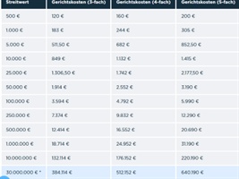In Österreich zahlt man für eine Klage mit einem Streitwert iHv EUR 1.000.000,00 Gerichtsgebühren im Umfang von ca. EUR 30.000,00.